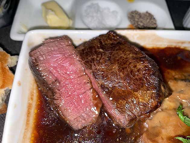 ・牛フィレ肉ステーキ赤ワインソース、秋茄子、椎茸、わさび菜