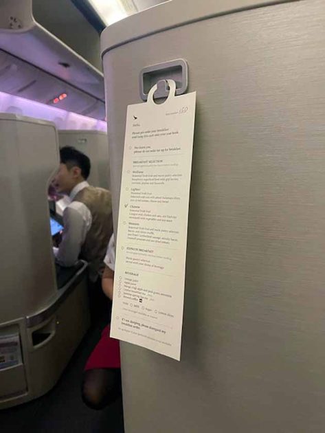 朝食のリクエストを書いてコート掛けにセットするとCAさんに回収されます。